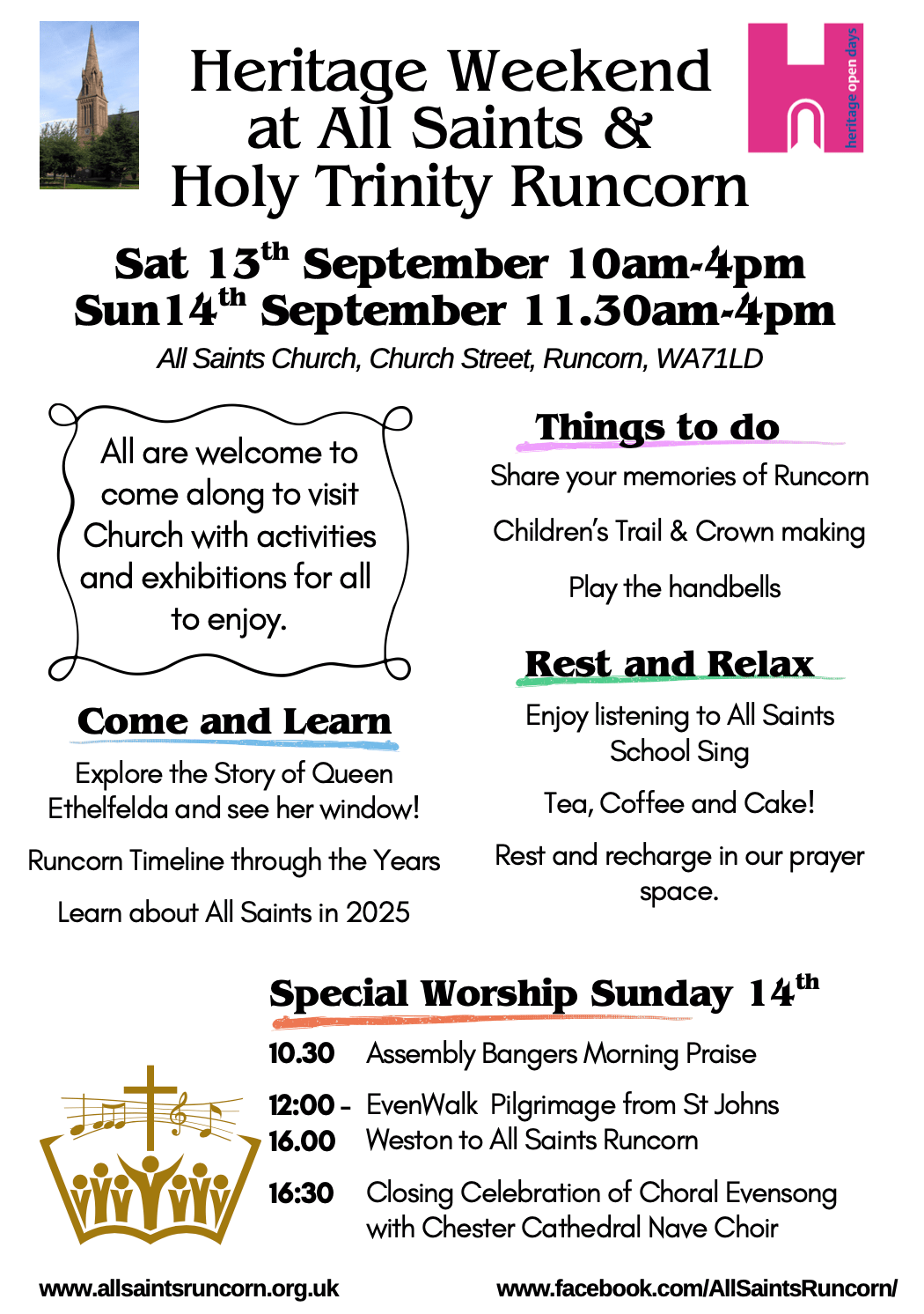 Heritage Weekend Come and join our celebration of the Church and town. Share you memories and discover what’s new! + Add to Google Calendar + iCal / Outlook export Date Sep 14 2025 Expired! Time 10:00 am - 4:00 pm Location All Saints Church Church Street Opening Hour Runcorn Website http://WA7%201LD Category Heritage Days Organizer All Saints & Holy Trinity Runcorn